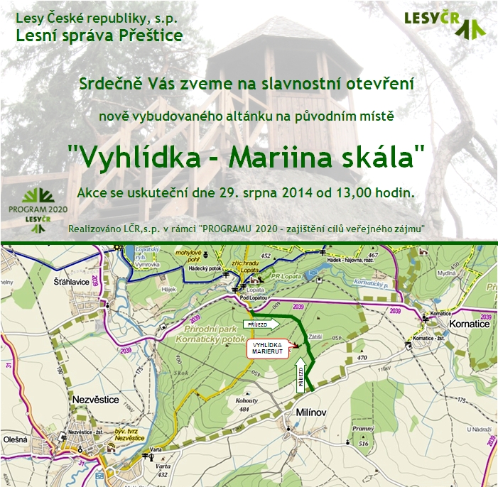 lesního komplexu Kamýky v okolí státního zámku Kozel na Plzeňsku v Plzeňském kraji. Díky vynaložené investici tak Lesy ČR již tento pátek 29. srpna 2014 od 13 hodin slavnostně otevřou nově vybudovaný vyhlídkový altánek na Mariině skále. Kromě toho však Lesy ČR v současnosti dokončily další tři významné místní investice: rekonstrukci lesní cesty Kolejka i výstavbu odpočinkového místa Mariino zátiší a parkoviště u Kornatického rybníka. Všechny jmenované projekty, nacházející se v katastru obce Milínov, Lesy ČR realizovaly v rámci „Programu 2020 – zajištění cílů veřejného zájmu u LČR“ sloužícího k podpoře a rozvoji veřejně prospěšných funkcí lesů. Lesy v okolí zámku Kozel jsou protkány množstvím turistických tras i cyklotras včetně dvou vyznačených naučných stezek. Samotný zámek Kozel patří k nejnavštěvovanějším památkám Plzeňského kraje.