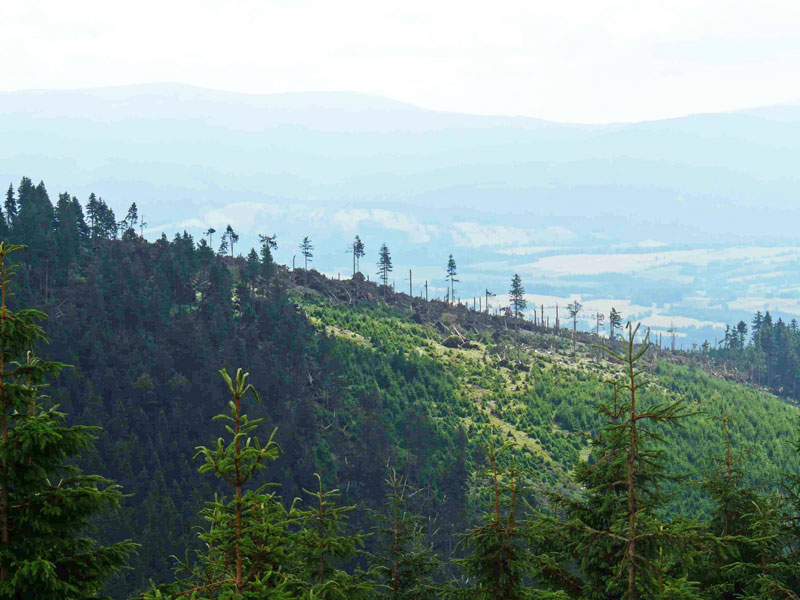 Narušený kořenový systém a rozvolněné zbytky porostů pak v této lokalitě ještě poškodil letošní únorový a květnový vítr. Dokončování těžby dalších narušených porostů bude pokračovat ještě několik měsíců.