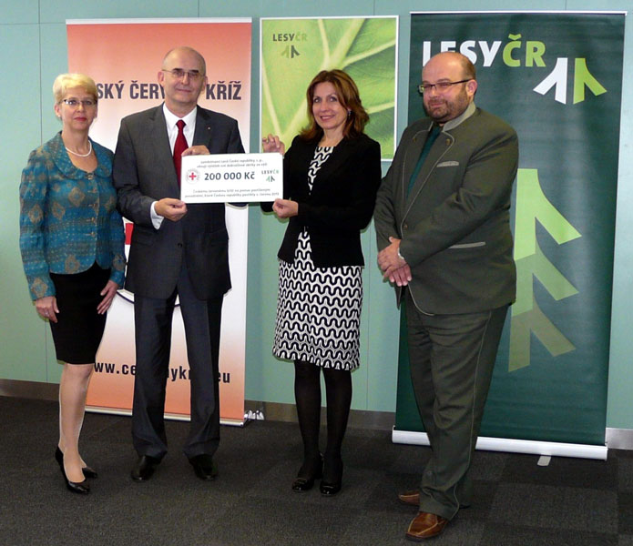 Ředitel lesního a vodního hospodářství podniku Pavel Indra společně s pověřenou ekonomickou ředitelkou Katarínou Šafránkovou předal dnes za zaměstnance Lesů ČR symbolický šek ve výši 200 000,- Kč řediteli Úřadu Českého červeného kříže (ČČK) Josefu Konečnému. ČČK využije finanční prostředky darované zaměstnanci Lesů ČR k následné pomoci povodněmi postiženým lidem. Předání symbolického šeku se uskutečnilo v budově ředitelství Lesů ČR v Hradci Králové.